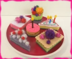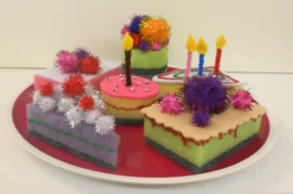 De gebakjes op de laatste 2 foto’s zijn gemaakt van schuursponsjes en versierd met vilt en glitterpompoms. Voor de kaarsjes heb ik pijpenragers gebruikt.