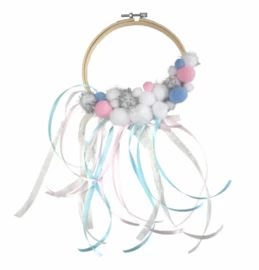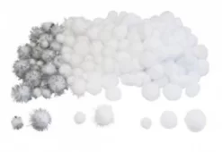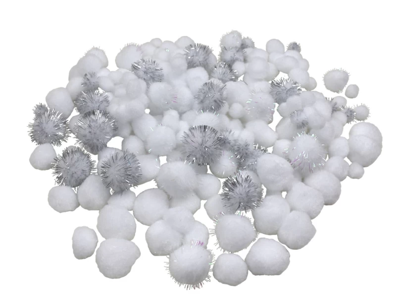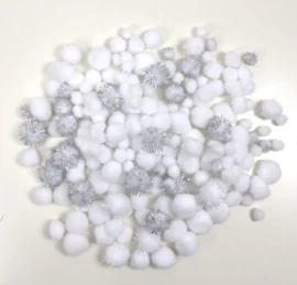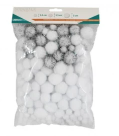 In een zak zitten 200 pompoms in 3 verschillende maten. De meeste zijn helemaal wit, maar er zijn er ook een aantal met zilverglitter wat voor een mooie schittering zorgt.