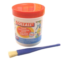 Voor kleine kinderen is dit de meest eenvoudige manier om te plakken; met dikke lijm uit een potje en een lijmkwastje, of een lijmspateltje.
