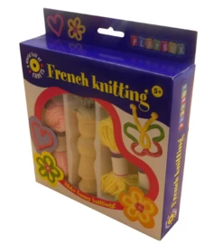 Hierin zit een houten punnik klosje, een haaknaald en 3 bolletjes wol.