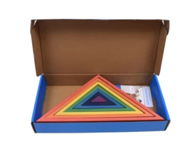 De set driehoeken bestaat uit 7 kleurrijke driehoeken die allemaal in elkaar passen. De grootste driehoek is 20,9 x 20,9 x 29,5cm en alle driehoeken zijn 4cm breed.