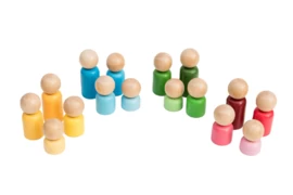 Elke familie bestaat dus uit 4 popjes in 4 verschillende lengtes. Elke famili heeft zijn eigen kleur waarin elk familielid dan weer zijn eigen tint heeft.