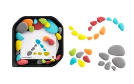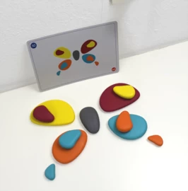 Met de stenen kan je de patronen op de voorbeeldkaarten namaken, je fijne motoriek oefenen door ingewikkelde stapelconstructies te maken, of gewoon zelf mooie mozaïek figuren te verzinnen.