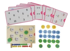 In de houten kist schuif je steeds 1 opdrachtkaart en met de houten schijfjes met getallen erop ga je dan de antwoorden invullen. Er zit een telraam bij met 20 kralen voor als je nog wat hulp nodig hebt.