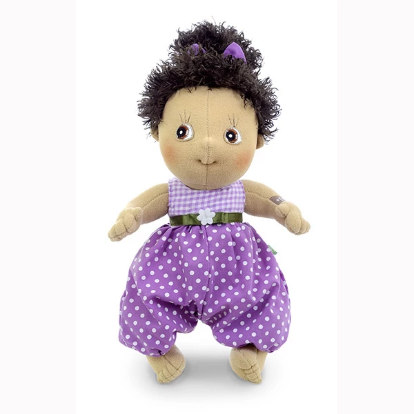 Hannah is een meisjespop met donker haar en een paars broekpakje.