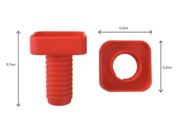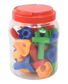 In de ton zitten 16 schroeven in 4 verschillende kleuren en met 4 verschillend gevormde koppen. Bij elke schroef hoort een bijpassende moer in dezelfde kleur en met dezelfde vorm als de kop van de schroef.