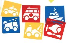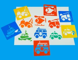 Set van 6 kunststof sjablonen met afbeeldingen van eerste hulp voertuigen.