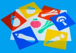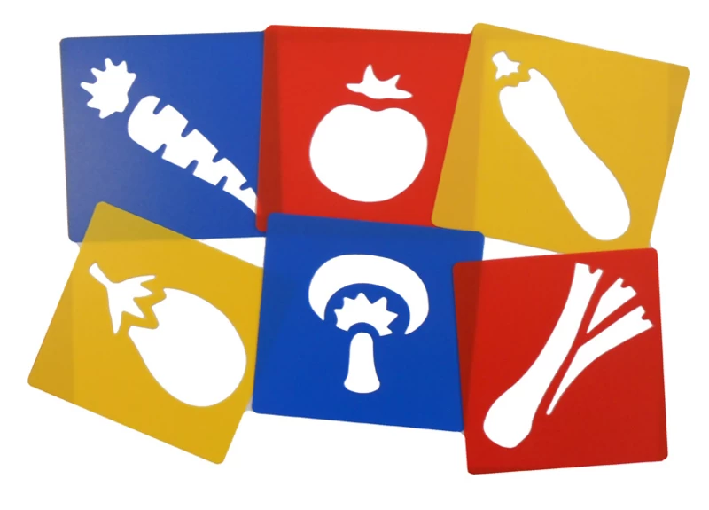 Set van 6 afwasbare sjablonen. Door de grote figuren zijn ze goed hanteerbaar voor kinderen en ze hebben aansprekende afbeeldingen.