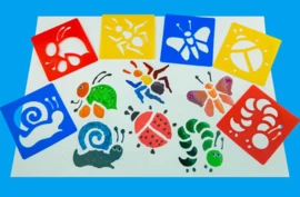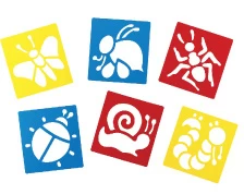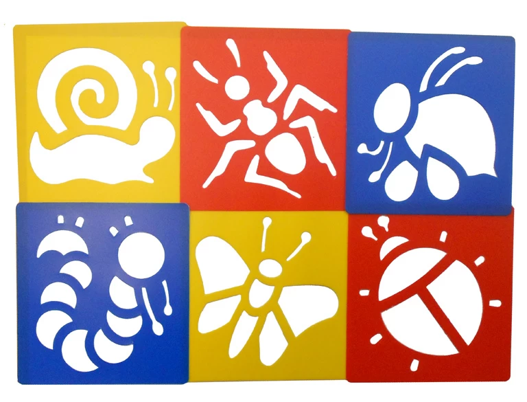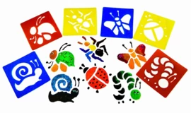 Set van 6 stevige sjablonen van afwasbaar kunststof (dus opnieuw te gebruiken) met afbeeldingen van 6 verschillende kriebelbeestjes.