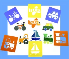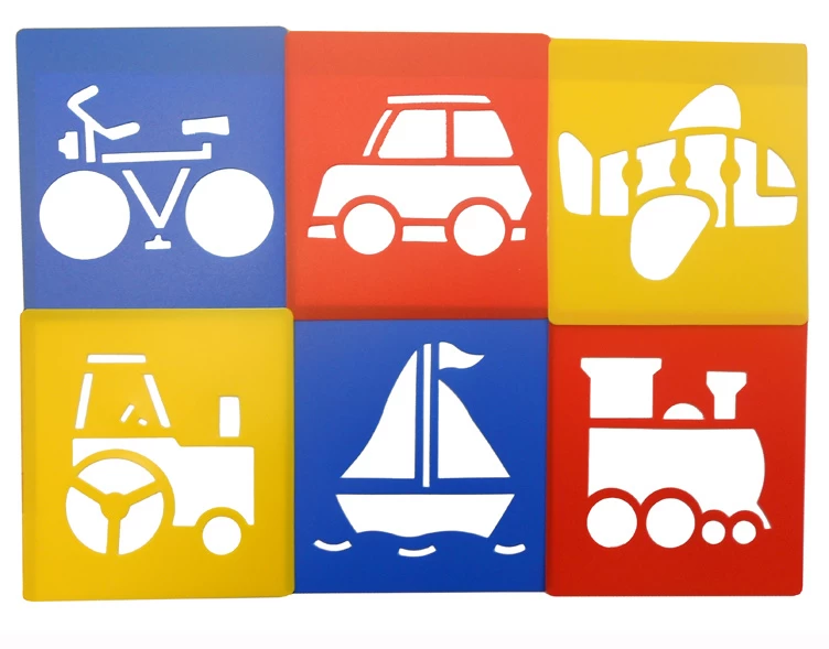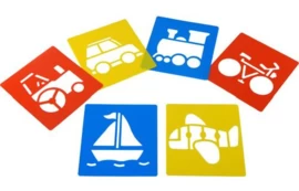 Set van 6 afwasbare sjablonen. Door de grote figuren zijn ze goed hanteerbaar voor kinderen en ze hebben aansprekende afbeeldingen.