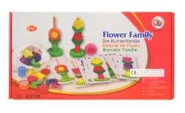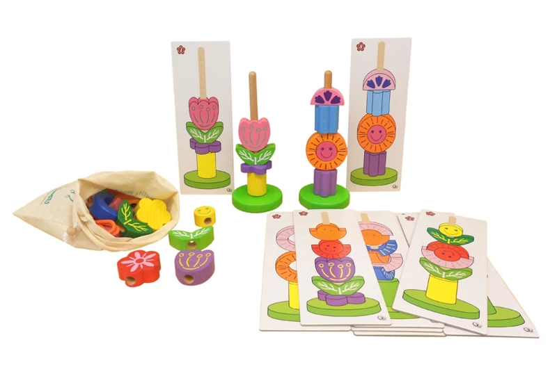 Volgorde spel waarbij je de bloemen op de voorbeeldkaarten na moet maken door gekleurde kralen op de houten pinnen te rijgen.