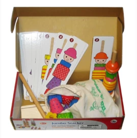 Schitterend uitgevoerd in vrolijke kleuren. In de doos zitten 2 houdertjes voor stokjes en voorbeeldkaarten, 12 voorbeeldkaarten, een heleboel grote kralen in een stoffen zak en een rijgveter om van de kralen ook nog een ketting te kunnen maken.