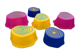 De set bestaat uit 2 grote stapstenen, 2 middelmaat stapstenen en 2 kleine stapstenen. En je kan ze helemaal in elkaar stapelen waardoor het bij het opruimen nauwelijks plek inneemt.