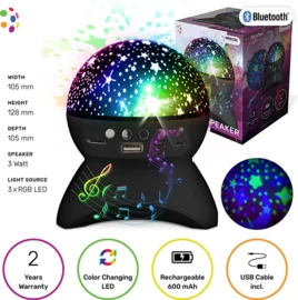 Behalve een projector is dit ook een speaker; je kan hem aansluiten op bijvoorbeeld je telefoon om er muziek op af te spelen. Dit kan via bluetooth en via een kabeltje. Dit is geheel optioneel; je kan hem ook zonder muziek gebruiken, dan is het gewoon een lamp.