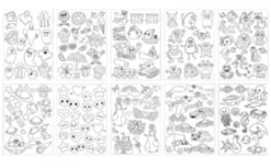 Het zijn een soort mini kleurplaatjes op een stickervel. Maar dan niet met zo’n glanzend laagje erover, want dat kleurt niet fijn.