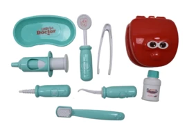 Bestaat uit een kunststof koffer met handvat met daarin allerlei verschillende tandartts gereedschappen (zoals een spiegeltje en een haakje en een boor) en ook nog een gebit om alles op te oefenen.