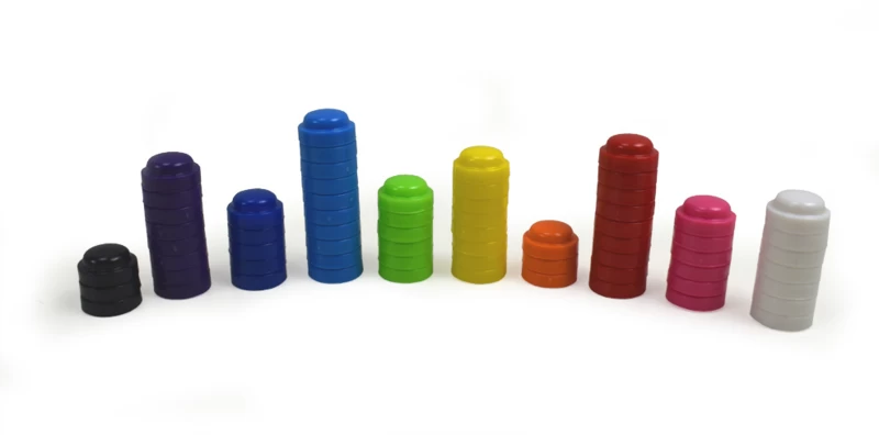De dopjes zijn heel makkelijk op elkaar te stapelen en dan kan je gaan tellen. Er zijn 10 verschillende kleuren. Dat maakt dat het er heel vrolijk en aaantrekkelijk uitziet, maar het is ook praktisch.