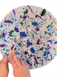 Eerst maak je een mooi kunstwerk op het papier met stift (op waterbasis), waterverf of aquatint (vloeibare waterverf met heel veel pigment). Dan pak je de plantenspuit en maak je je kunstwerk helemaal nat; je mag het echt doorweken. Daardoor gaan de kleuren vloeien en lopen ze prachtig in elkaar over.