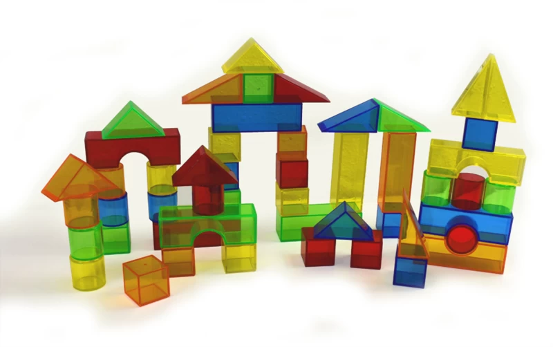 De blokken zijn gemaakt van transparant plastic in 5 verschillende kleuren.