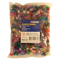 Zak met 1000 gekleurde, doorzichtige kralen met extra grote gaten. Een groot deel van deze kralen zijn letterkralen. Je kan dus mooie naamkettingen maken met afwisselend letterkralen en gewone kralen.