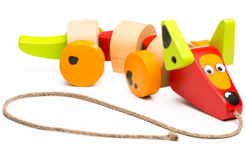 Deze schattige hond bestaat uit verschillende segmenten die ervoor zorgen dat de hond vrolijk gaat wiebelen als je hem achter je aan trekt.