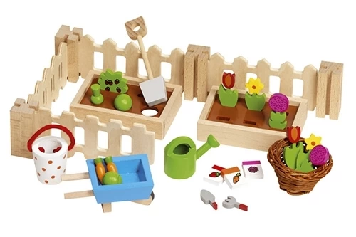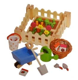 In de set zit: 4 hekjes, 2 plantenbakken, groentes en bloemen voor in de plantenbakken, een schep, een emmer, een kruiwagen, een gieter, een mand en klein tuingereedschap.