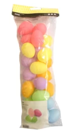 Zak met 24 kleine kunststof verrassingseieren in pastel kleuren.