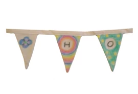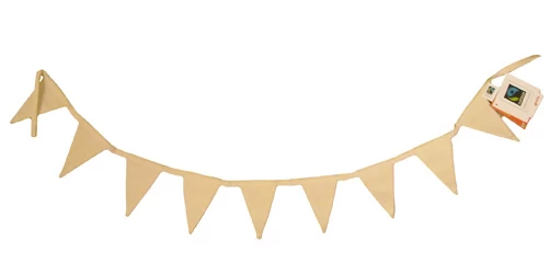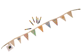 Een blanco katoenen vlaggenslinger die je zelf kan versieren met wasco of textielstiften