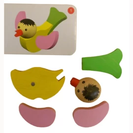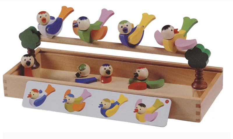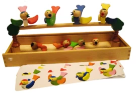 Op de houten stok passen 4 vogeltjes die bestaan uit een lijfje, 2 vleugeltjes, een hoofdje en een staart. Deze onderdelen zitten vast met magneetjes en kan je onderling verwisselen. Om de vogeltjes op het voorbeeldkaartje na te maken moet je goed kijken. De kleuren van alle onderdelen moeten natuurlijk kloppen, en bij de vleugeltjes moet je ook nog kijken of je ze langs het lijfje plakt ofdat ze opzij moeten staan.