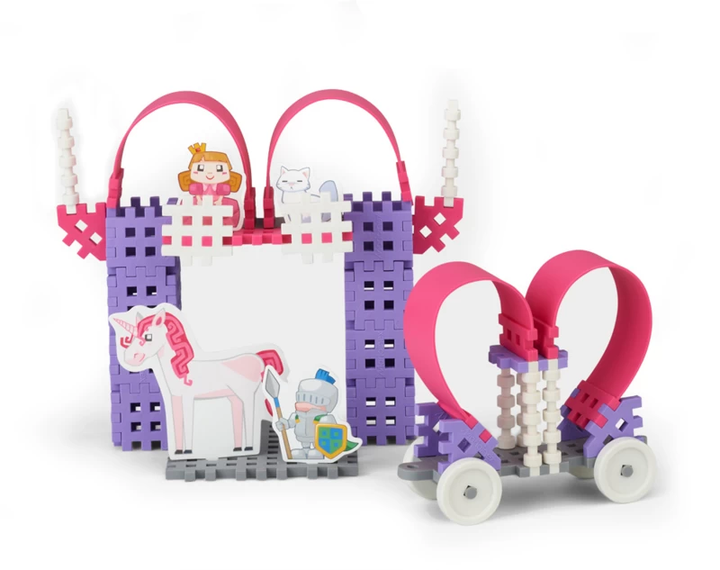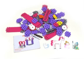 Met deze kasteelset bouw je niet alleen het kasteel, maar ook een koets. De overwegend roze en paarse lokjes laten het er sprookjesachtig uitzien en de kartonnen prinses, ridders en eenhoorn zitten er ook bij.