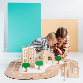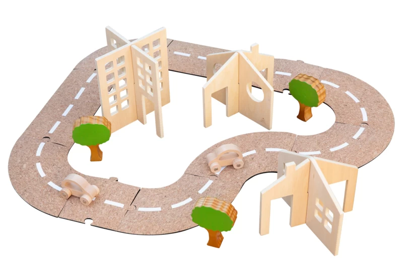 Een wegenset van kurk (gemaakt van natuurkurk en rubber) in combinatie met 3 blank houten gebouwen, 3 bomen en 2 blank houten autootjes.