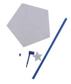 Je zet het kartonnen molentje op de pin. Daarvoor is in het midden van het molentje een gaatje gemaakt. Vervolgens vouw je de flappen van het molentje 1 voor 1 naar binnen en duw je ze ook op de pin (om het molentje extra stevig te maken en om te zorgen dat hij beter draait kan je dit eventueel even vastzetten met een nietje), vervolgens schuif je het kartonnen sterretje er overheen (daardoor zie je de eventuele nietjes niet meer) en je sluit het geheel af met een gekleurde stop.