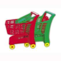 Deze kunststof boodschappenkar is heel sterk en eenvoudig schoon te maken. Net als echte winkelwagentjes kan je ze in een rijtje in elkaar schuiven. En in het zitje voorin de wagen past je pop!
