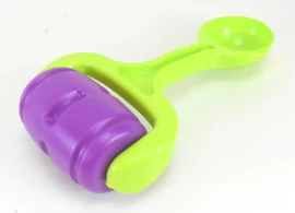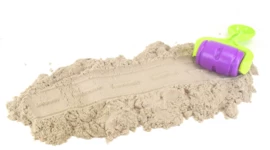 Als je de roller door het zand heent duwt laat hij de afdruk van een weg met 2 banen achter.