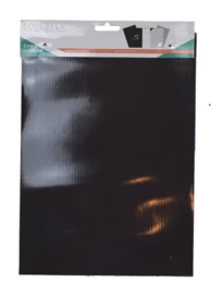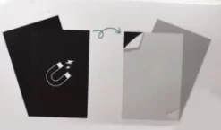 De ene kant van het vel is magnetisch en de andere kant kleeft; als een soort sticker trek je het witte velletje eraf en dan plak je het ergens op. Dat kan op vrijwel alle gladde oppervlakken.